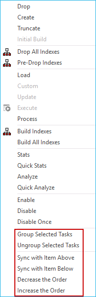 Click to remove all groupings and make all tasks sequential. New groupings can be made by selecting a range of sequentially listed tasks in the left pane and using the right-click menu option Group Selected Tasks. Tasks that are grouped have the same first two numbers in the order and can execute at the same time if the job has multiple threads.