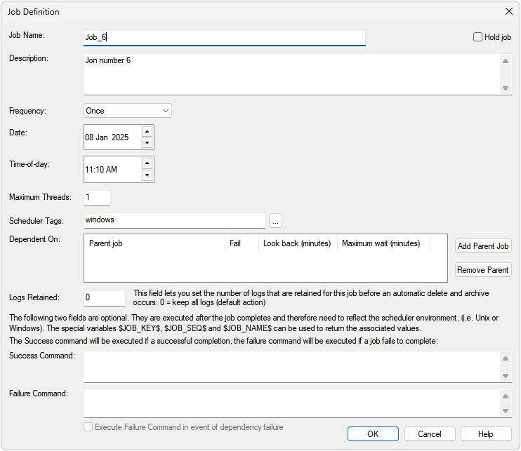 Dependent OnA job can be dependent on the successful completion of one or more other jobs. Click the Add Parent Job button to select a job that this job will be dependent on. The maximum time to look back for parent job completion field prevents older iterations of the parent job as being identified as a completion. The maximum time to wait specifies how long to await a successful completion of the parent job. The action if that wait expires can also be set. Refer to the Job Dependency example in Scheduling a Job for details.