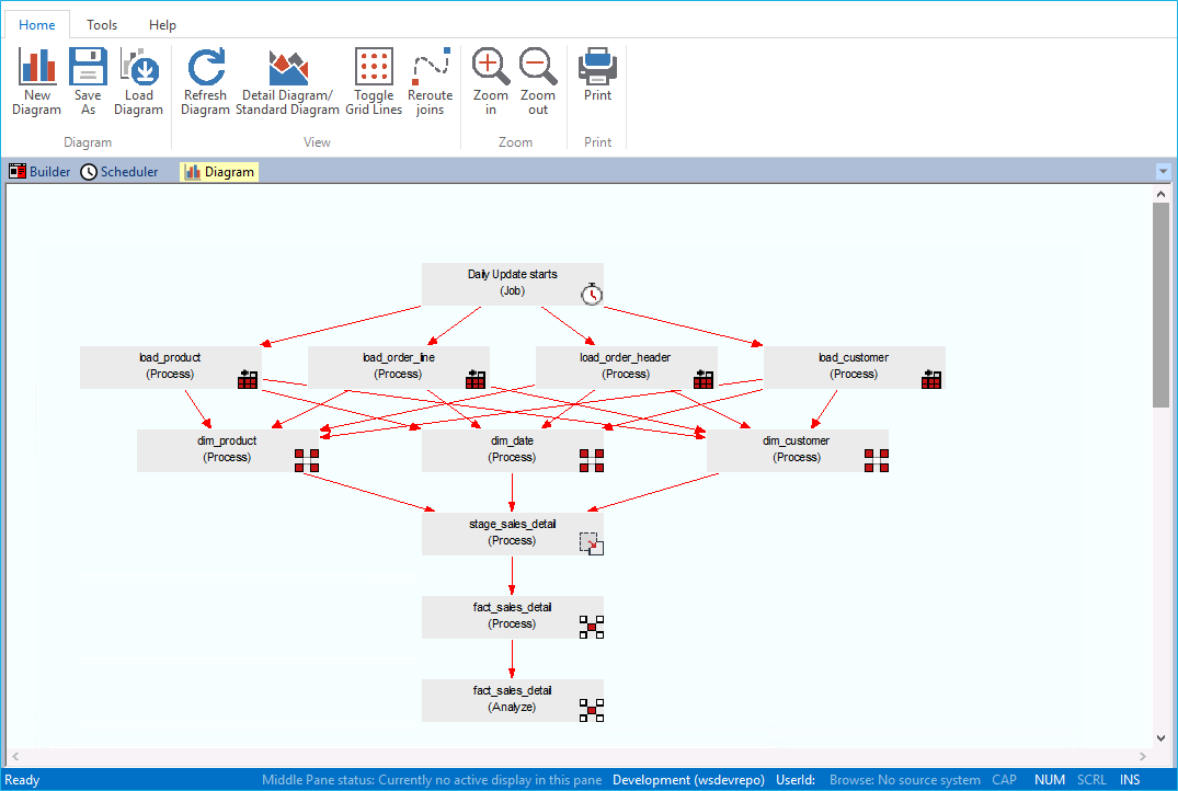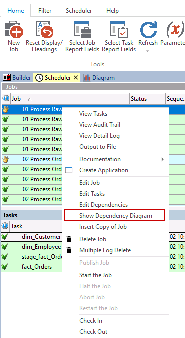 Select the Show Dependency Diagram option from the right-click menu of any job, to see all job dependencies displayed as a Diagram from RED's Diagram view tab.