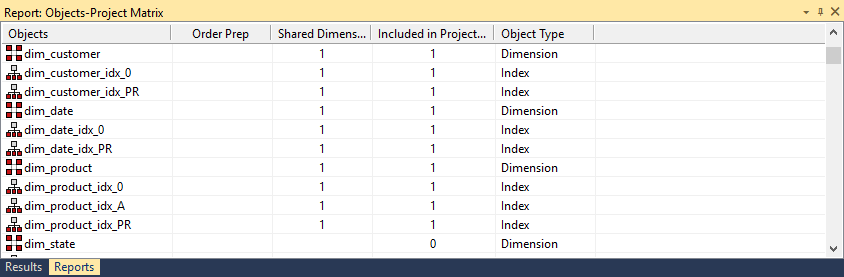 The results of this report are displayed as a list of objects in the metadata repository that are in one or more projects (other than All Objects) with the following columns as a grid: