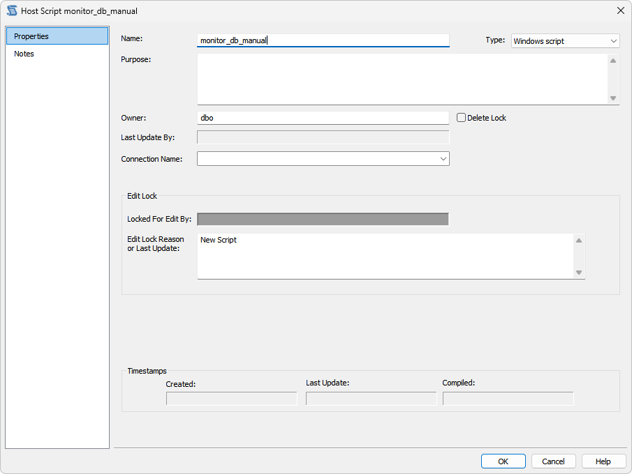 - Click Add, and the following Properties window appears. Select the script type; either UNIX or Windows script. Select the appropriate connection from the Connection Name drop-down. Fill in the Purpose field to define the role of the script and then click OK to save the changes.