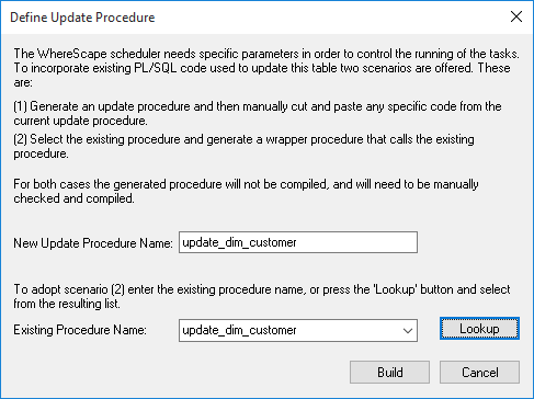 If the target table is a dimension, stage, fact or aggregate a dialog box will ask if an update procedure or update template is required. If selected a subsequent dialog will define the structure and content of this procedure. If an existing procedure is to be modified to include the scheduler imposed procedure standards it is best to select this option and use the existing procedure name to cut down on the amount of work required. The existing procedure can then be loaded into the generated procedure using the procedure editor.