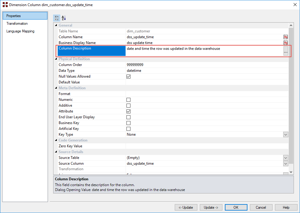 The column comments are defined in the Column Description field of the column's Properties. The comments in this field, along with the Table Name, Column Name, and Column Title/Business Display Name fields are used when exporting/importing column comments.