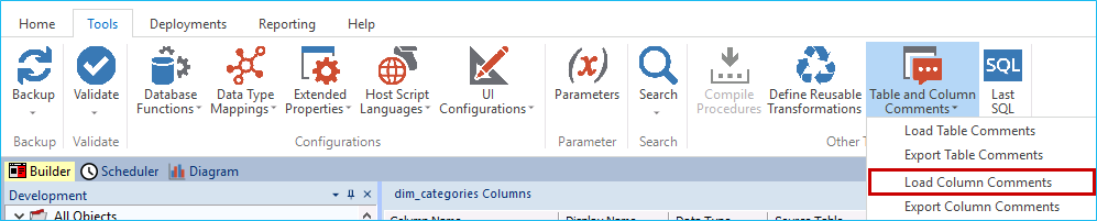 6. Use the Update Comments command from the context menu, to copy the comments from the metadata repository to the corresponding columns in the target database.