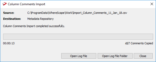 3. Click OK to proceed with the import. The Column Comments Import pop-up window displays the progress of your import. You can click Cancel to abort the process.