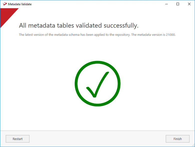 After the validation, the confirmation message for your successful validation will appear. Click Finish to close the dialog, otherwise, click Restart to start over.
