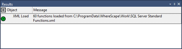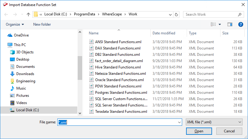 The following screen is displayed. Select the xml file to load the database functions. By default, RED expects the XML files to be in ProgramData\WhereScape\Work directory.