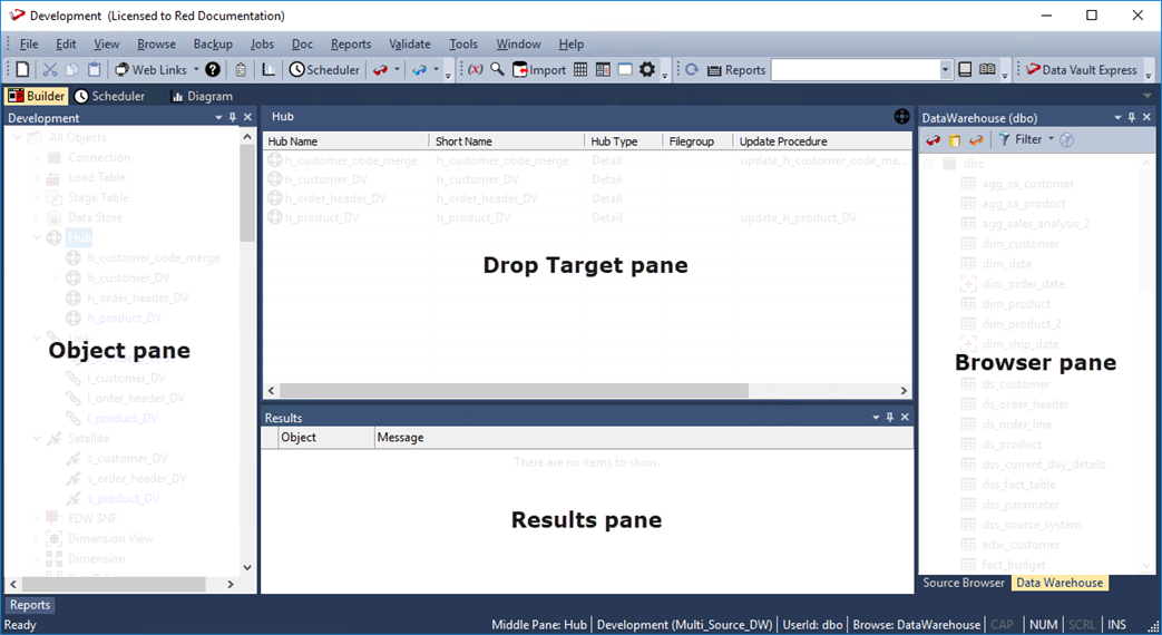 Browser Pane | This pane displays both Source and Data Warehouse systems. There are two browser panes available at any one time. The source may be the data warehouse itself. The Browser Pane can be filtered: