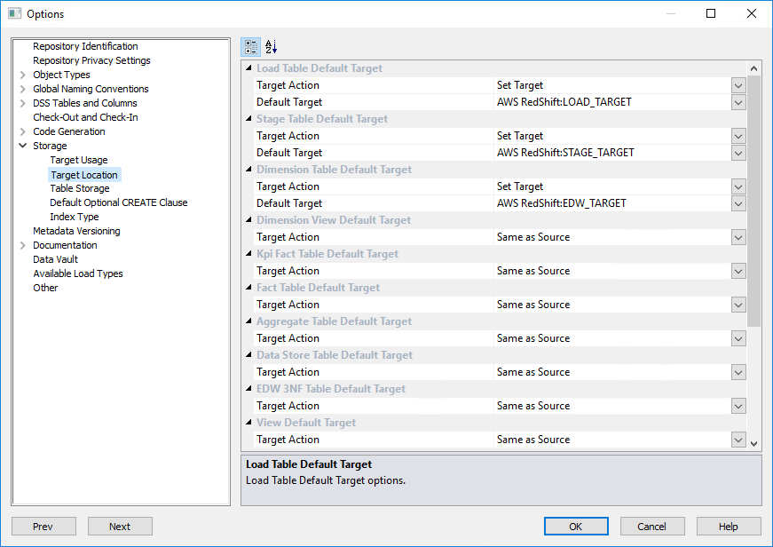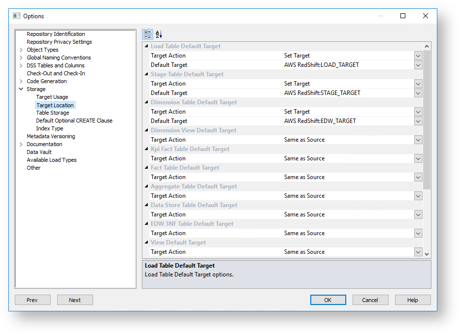 This option enables you to set a default target for new tables to be created. It enables the Default Target drop-down list where a specific target for new tables can be defined.