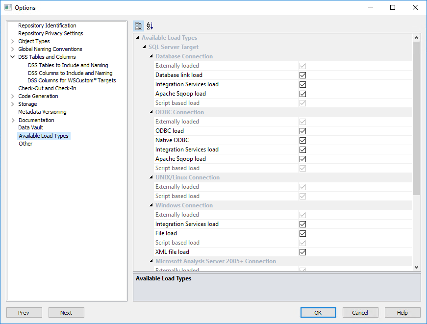 Select from the combination of load types supported by target and source databases, to control the default load type options that can be set by users from the Connection and the Load table Properties windows.