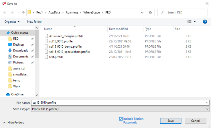 Select a name to save the file as and choose to Include Session Passwords. To ensure that all credentials are stored (as needed for the RED Scheduler service) then make sure to open each Advanced Connect flagged connection and set the session credentials prior to saving the Profile.
