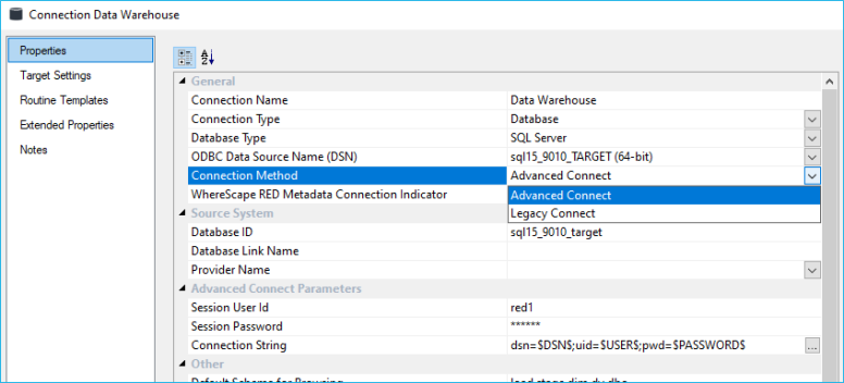 In Legacy Connect mode you can only control DSN, User ID and Password attributes when connecting via ODBC which depending on the vendor's ODBC driver can limit the authentication methods available in your environment when working with RED. If not using Windows or Active Directory authentication then credentials are required to be stored in the metadata repository which can be undesirable.