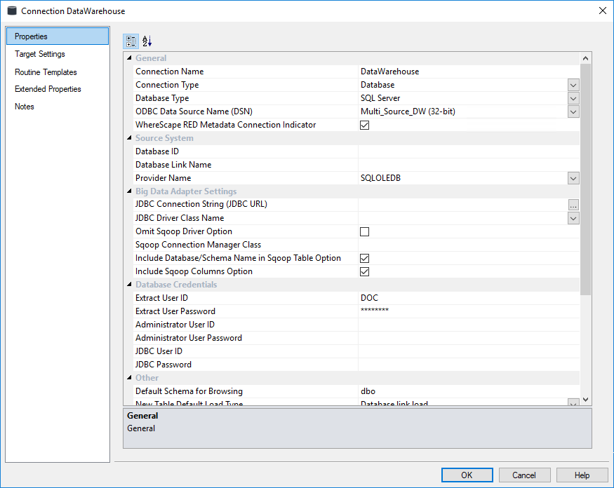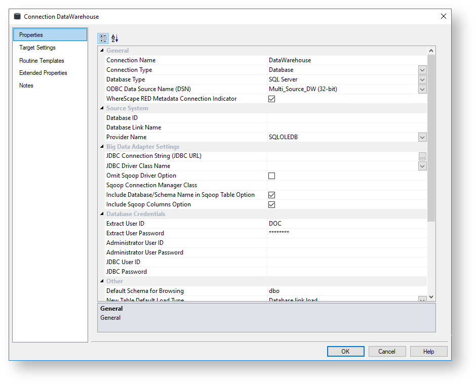 This topic describes the details of the connection Properties as they apply to Database type connections and specifically of the Data Warehouse or Metadata repository connection. The Data Warehouse connection is the connection that stores the metadata repository, and it is the connection that is used in the drag and drop functionality to create the Dimension, Stage, Fact and Aggregate tables.