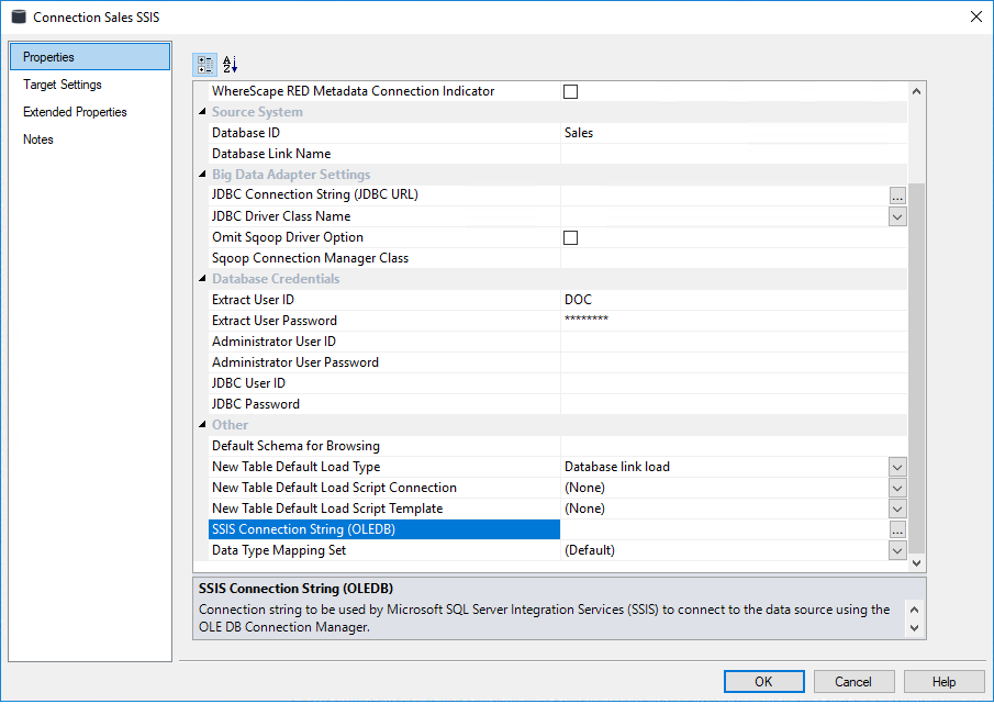 If the connection is a database load, then there is additional connection information that should be supplied to use SSIS as a loading option.