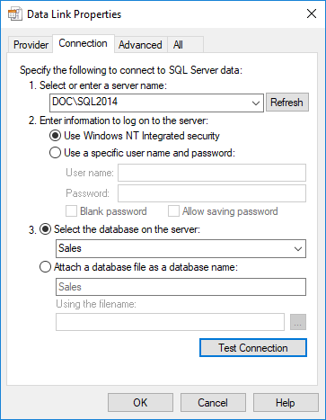 3. On the Connection tab, select the server name, enter the information to log on to the server and select the database on the server. Click Test Connection.