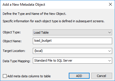 The option Add meta data columns to table is used for creating Load tables that are used in creating Data Vault objects. If this option is selected, two DSS columns ( dss_record_source and d ss_load_date ) are included in the meta data for the table and are populated by transformations. These two DSS columns could equally be applied to other Load tables not used in a Data Vault system but are particularly important to comply with the Data Vault standards. Refer to Data Vaults for details.