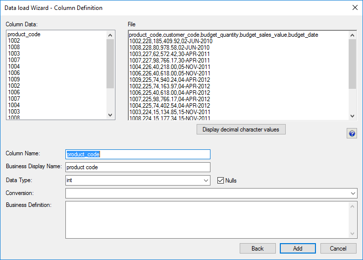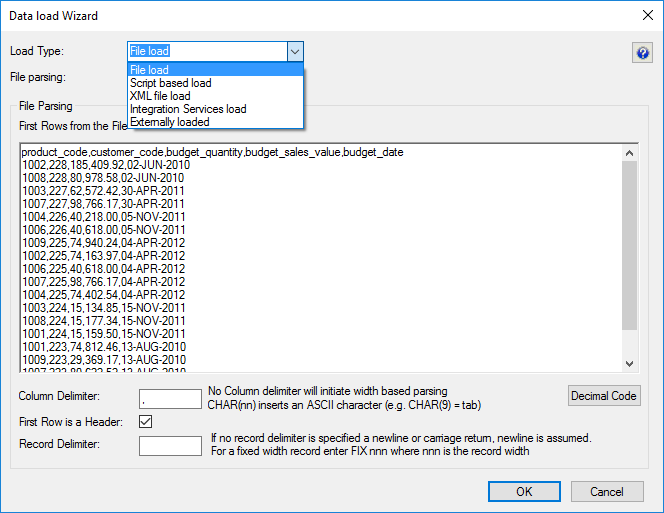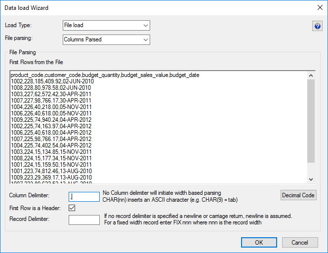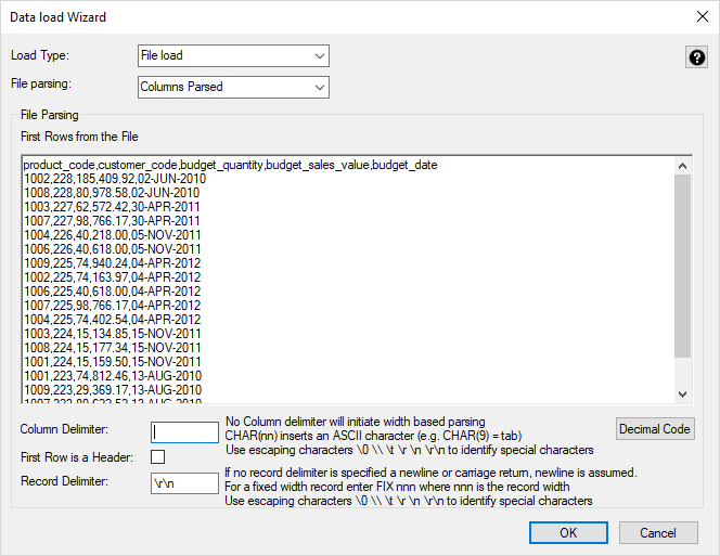 File parsing options- Single data column - with this option, the majority of the work in terms of parsing the file must occur in a subsequent procedure within the data warehouse. The data is dumped into a single column. The task of coding a procedure to parse the data must then be undertaken. Three columns are created under Oracle. These include the data column, a sequence column (row_sequence) and the file name column (row_file_name). The file name and sequence columns can be deleted if they are not required for a File based load.