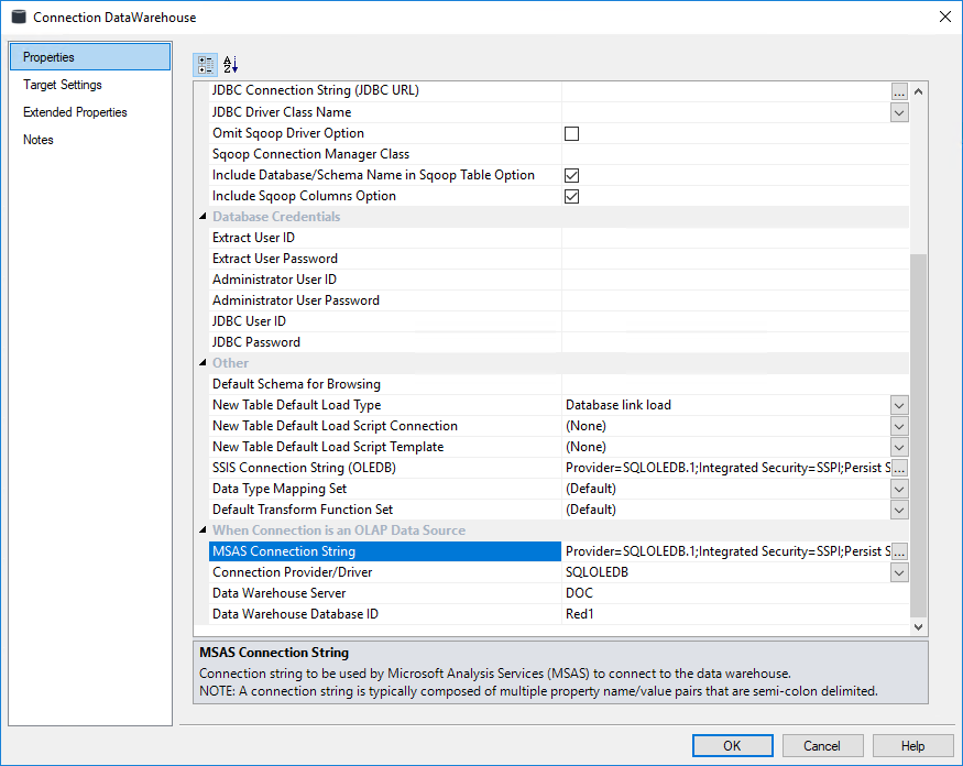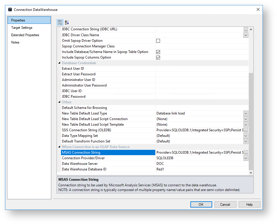MSAS Connection String | Connection string to be used by Microsoft Analysis Services (MSAS) to connect to the data warehouse. Note A connection string is typically composed of multiple property name/value pairs that are semi-colon delimited. |