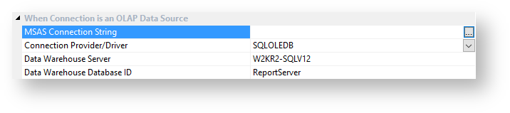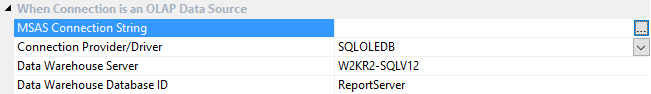 - The OLAP Connection String is built using a wizard. To activate the wizard, click the expander button.