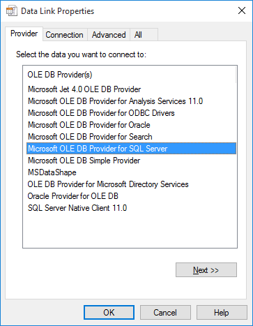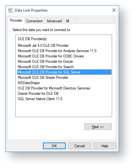 - In the Provider tab, select the OLE DB Provider and click Next.