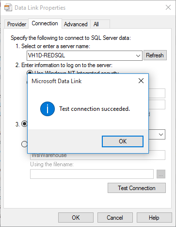 - Click OK in the success message and then OK again on the Data Link Properties screen.