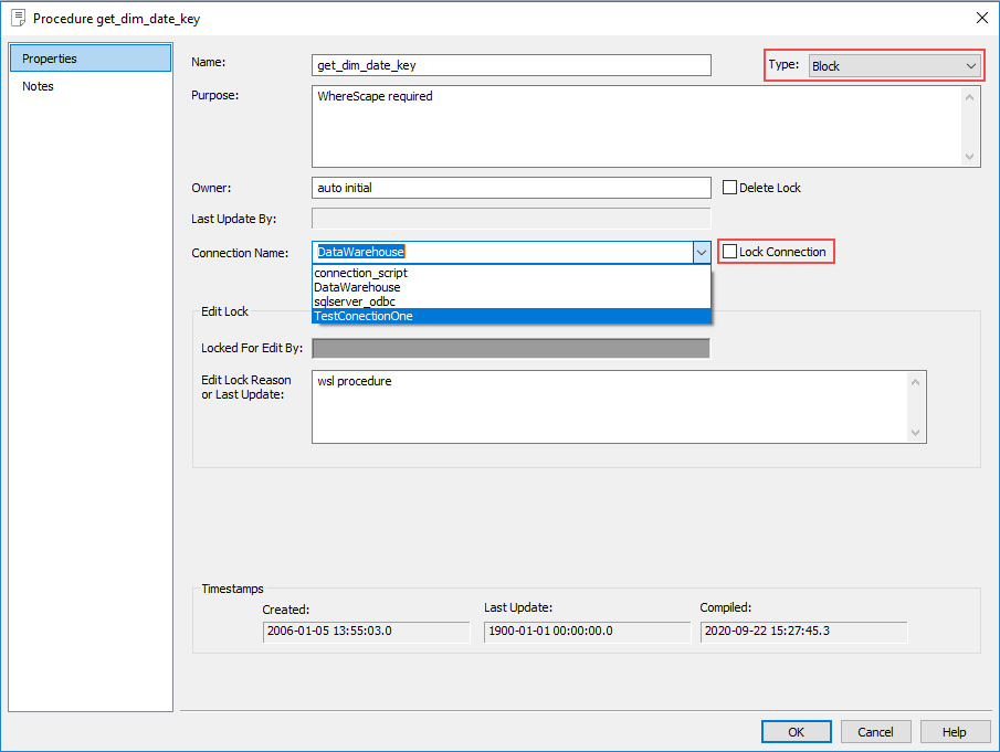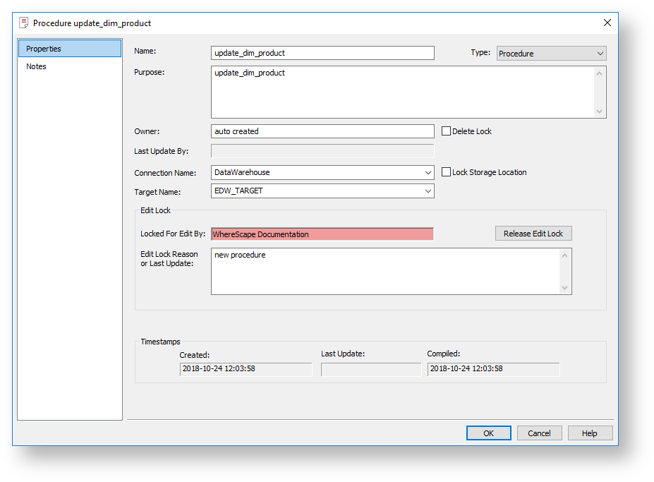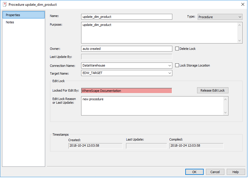 In the above example, the procedure is currently being edited, and is shown as Locked for Edit by "WhereScape Documentation". If procedures or scripts have already been opened for editing, they can only subsequently be opened for viewing.