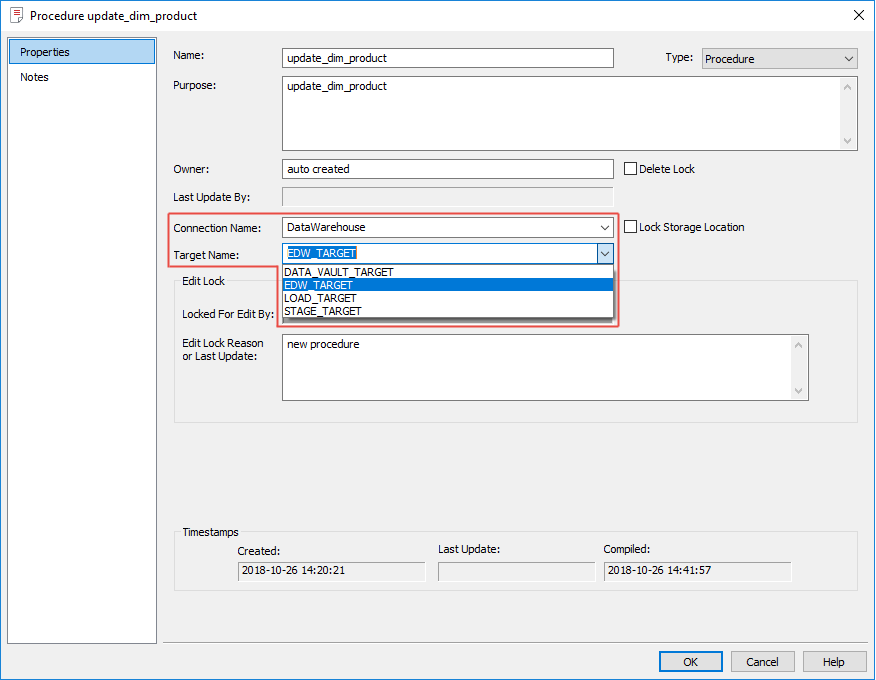 - Selecting the Lock Storage Location option in the procedure Properties window, enables you to retain the current location of the procedure, if the Target location of the procedure is manually changed and a Rebuild or Regenerate operation is performed, via the Table object's Properties window or from the Table object's right click Code context menu.
