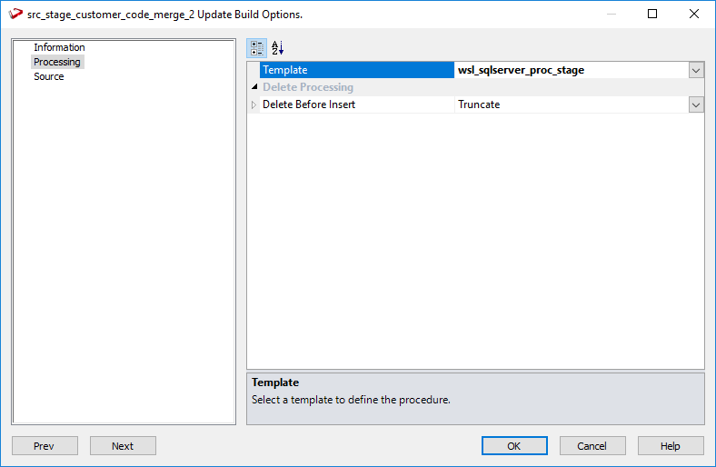 - On the Processing tab of the Update Build Options screen, select the template to use from the Template drop-down or use the previous update procedure template. Configure the other options available as required.