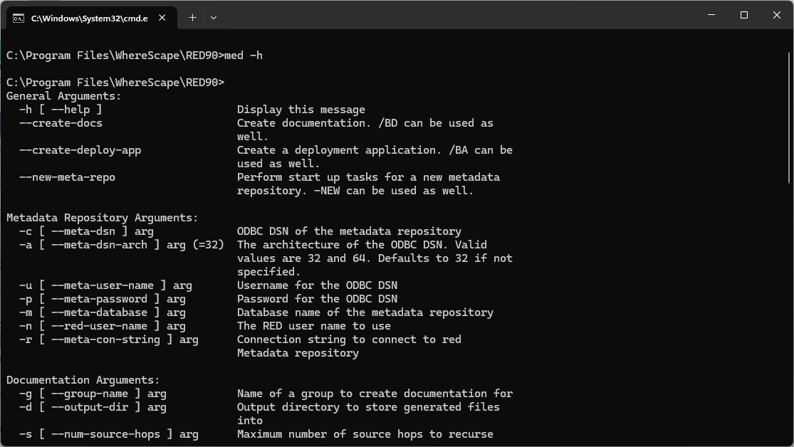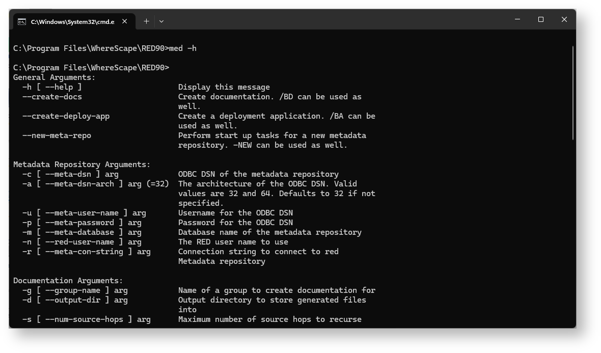The following is a sample Windows Command Prompt that displays the help for RED Client (med.exe) arguments.