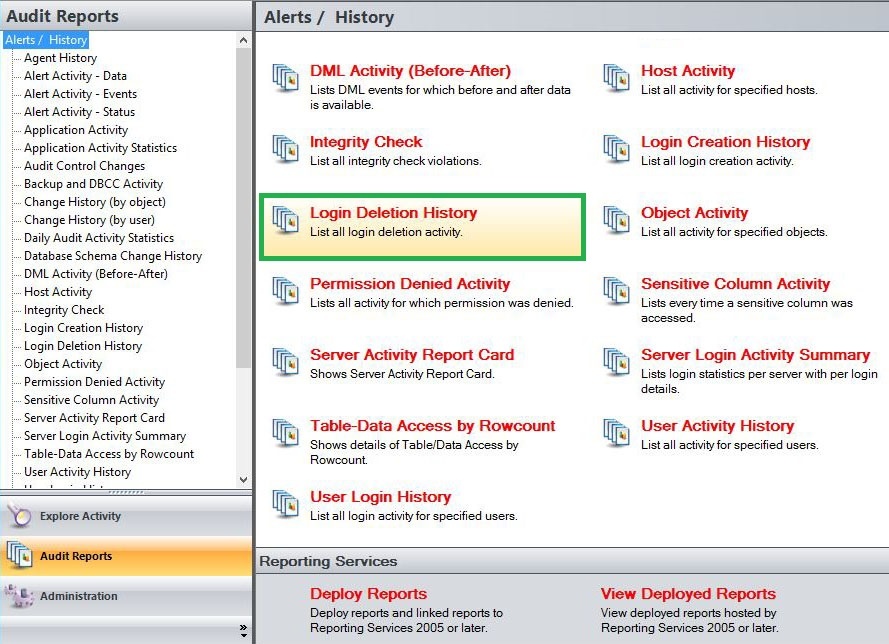 The Login Deletion History Report provides the history of login deletion activity. Use this report to audit user behavior and login management.