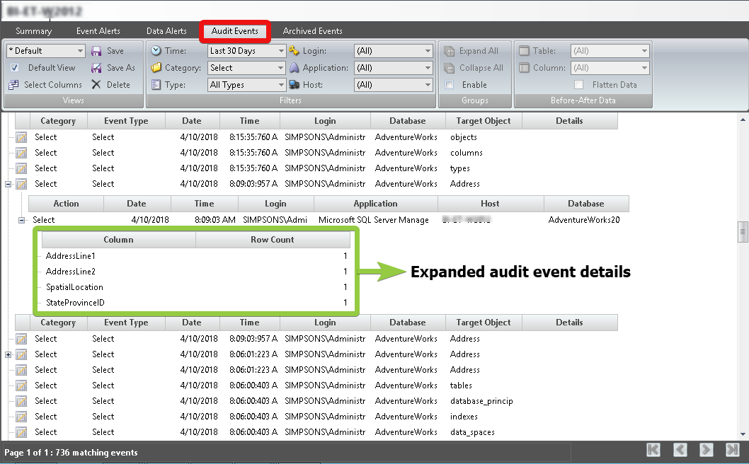 When you expand the audit events, the Audit Events tab shows the row count information in the event details.