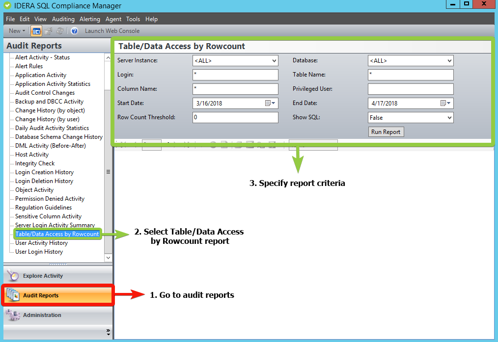 IDERA SQL Compliance Manager allows you to generate reports on data access, including the new row count feature. You can generate reports with the SQL Compliance Manager console and with Reporting Services.