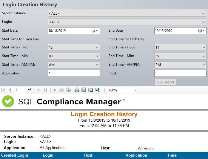 The Login Creation History Report provides the history of login creation activity. Use this report to audit user behavior and login management.
