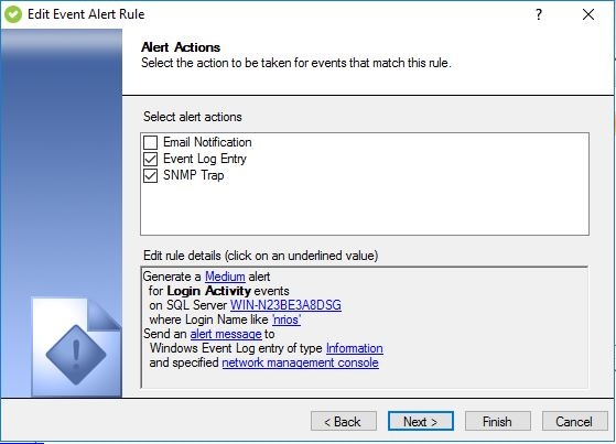The Alert Actions tab of the Edit Event Alert Rule wizard allows you to change the action you want this alert rule to perform when an audited event matches the specified criteria. Depending on the actions you select, IDERA SQL Compliance Manager will write an alert message to the application event log and email it to a specific email address or distribution list. You can use the default alert message or customize it to display the information you need most.
