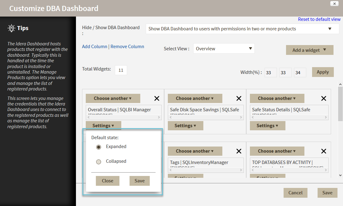 The Configure Dashboard Views option allows users to customize which product widgets are shown in the Overview and Details view tabs of the IDERA Dashboard.