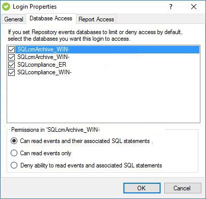 The Database Access tab of the Login Properties window allows you to specify access on each Repository database. Use this tab if your environment requires permissions settings that tightly control database access. For example, you can deny access to the Repository databases by default, but grant a login access to a specific Repository database.