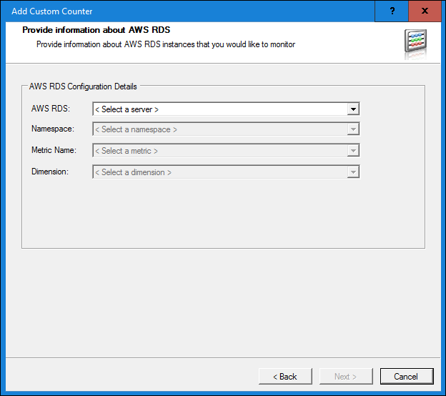 1. After you select the AWS RDS System Counter type when adding a Custom Counter, you need to provide some configuration details of your AWS RDS server: