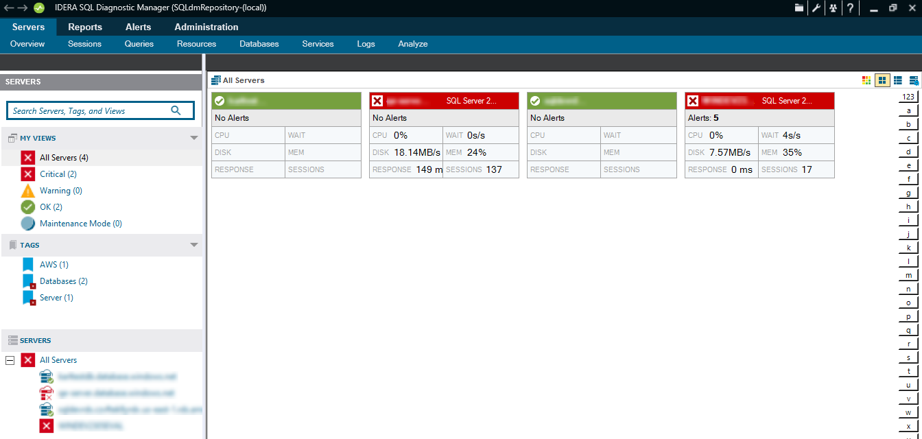 The Servers section lists the SQL Server instances contained in the currently selected view. To view all registered instances, select All Servers from the My Views list, review Monitor multiple SQL Server instances.