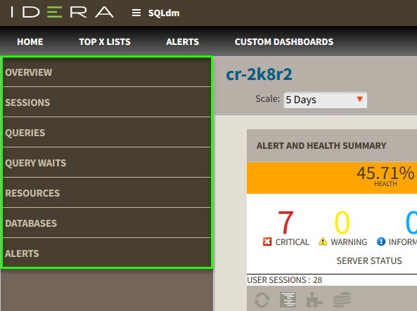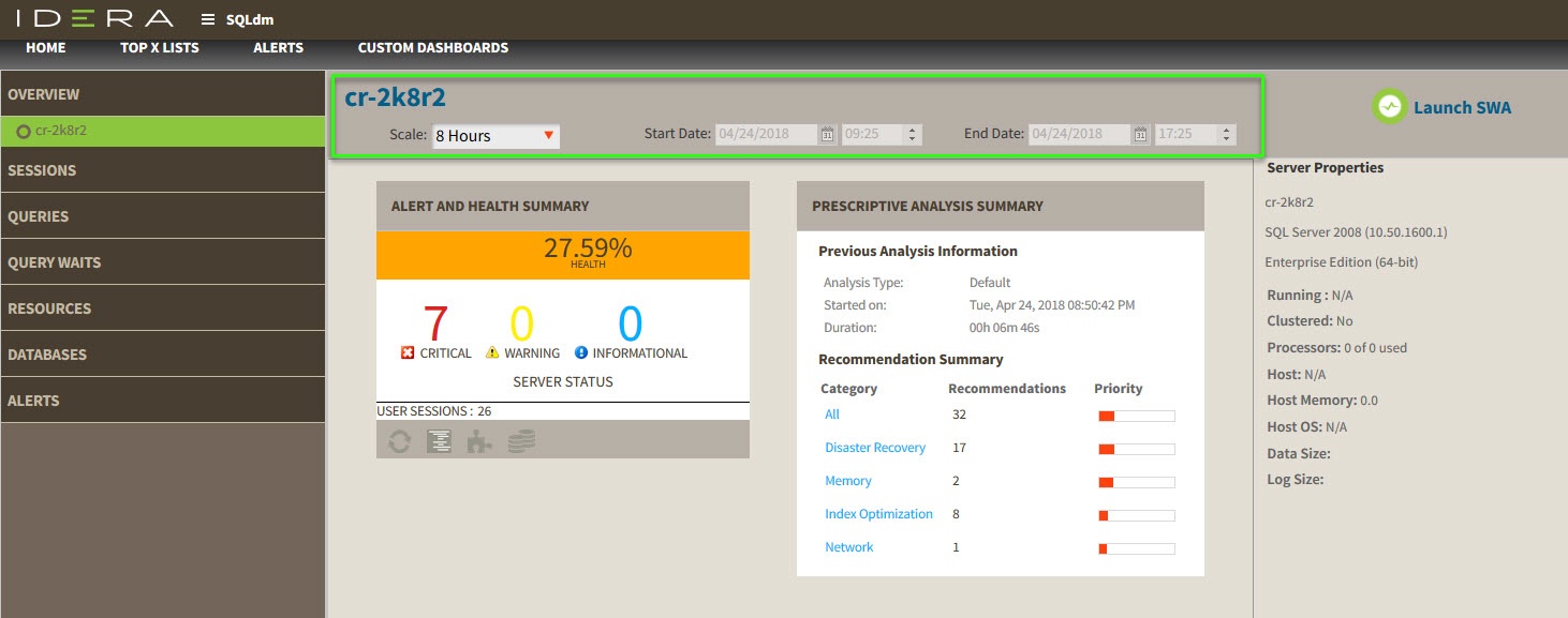 In this section, you find the health index, the alert status, and the user sessions from SQL Diagnostic Manager. Also, includes shortcuts to filter data through Sessions, Queries, Resources, and Databases.