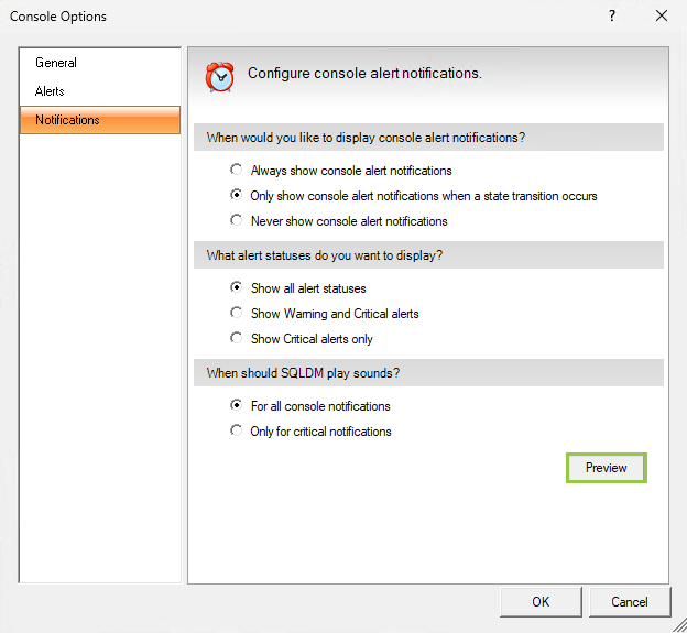 SQL Diagnostic Manager allows you to select when and for which alert states you receive alert notifications. You can select from the following options regarding when you want SQL Diagnostic Manager to display notifications: