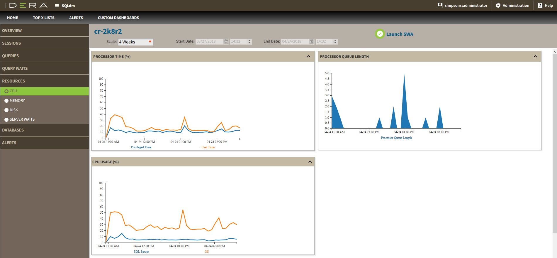 The Resources tab of the single instance dashboard contains several views such as CPU, Memory, Disk, and Server Waits. The Resources tab allows you to monitor the system resources on the computer hosting the SQL Server instance as well as what is used by SQL Server.