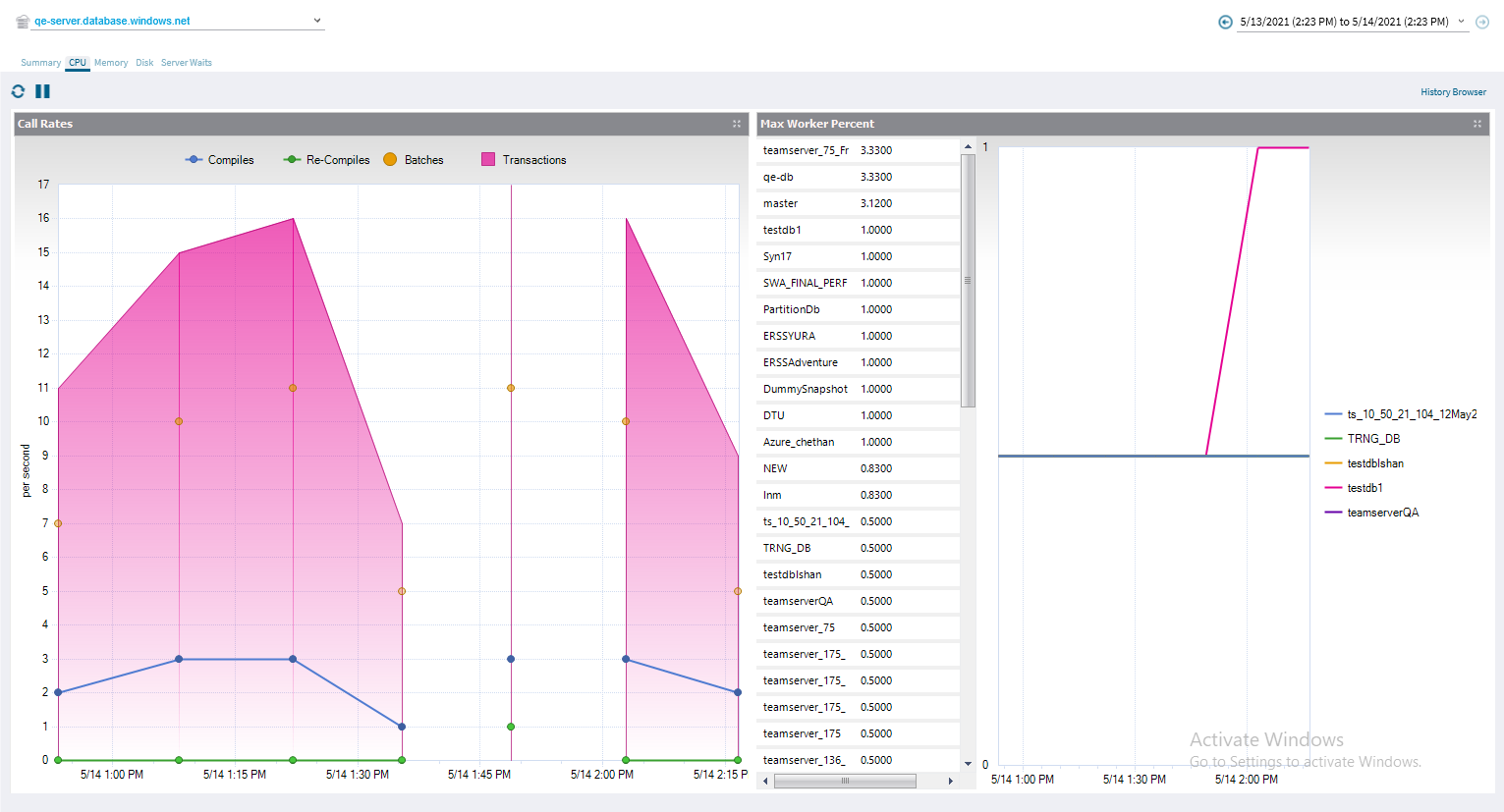 In addition, the Max Worker Percent chart shows the percentage of worker threads used on the database, relative to the maximum available for the service tier.