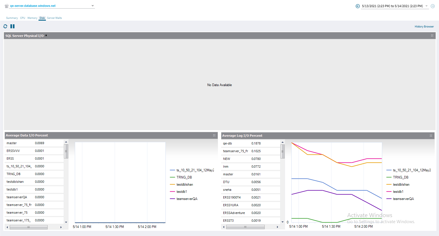 The Disk tab shows the key statistics on the way your disks are used on your Azure SQL server.