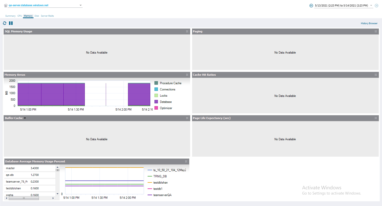 • Database Average Memory Usage Percent - Displays the percentage of memory used for the database, relative to the maximum available for the service tier.