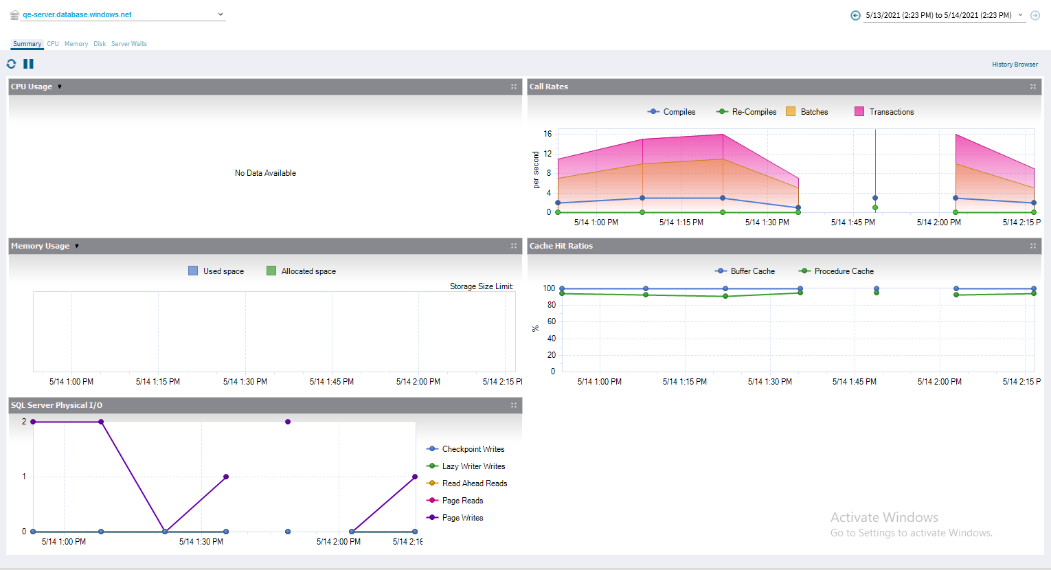 The Resources Summary tab displays real-time charts allowing you to quickly identify key diagnostic statistics for monitoring the resources for the selected Azure SQL instance.