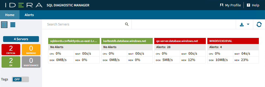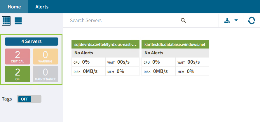 In the Home tab, you can check your monitored SQL Server instances status and drill down for details. Each view is expandable and information is grouped by server status or tags.