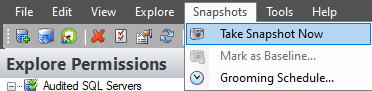 • Right Click the server to audit, select Take Snapshot Now from the context menu. You can right-click a server from the Security Summary view (Server in Policy tree) or Explore Permissions view (Audited SQL Servers tree).