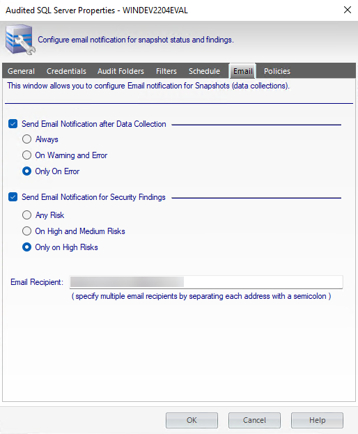 The Email tab allows you to configure the way email notifications are sent after a snapshot is collected. You can select to have email notifications sent after a snapshot is collected successfully, or only if there are warnings or errors. You can also select to have email notifications sent depending on the level of the security risks discovered.