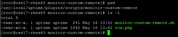 When installed on a Linux monitoring station those files will end up in a location similar to below. (In this example, Uptime Infrastructure Monitor was installed in the default /usr/local/uptime location). The 'monitor-custom-remote.sh' file comes from a similar sub-folder within the 'files-posix' folder.