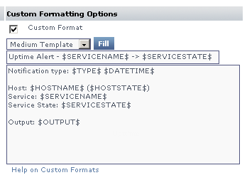- If you are using an email or pager notification, and want to use a custom message instead of the standard template, click the Custom Format check box to begin creating a custom alert message. Use the following steps to create the message: